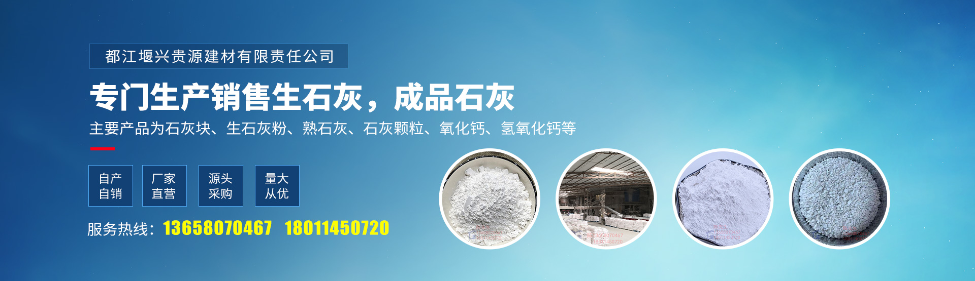 都江堰興貴源建材有限責任公司是一家以專門生產(chǎn)銷售生石灰,成品石灰的公司,擁有豐富的石灰石資源。工廠面積十余畝,在都江堰、峨眉均有產(chǎn)品供應基地。 主要產(chǎn)品為石灰塊、生石灰粉、熟...